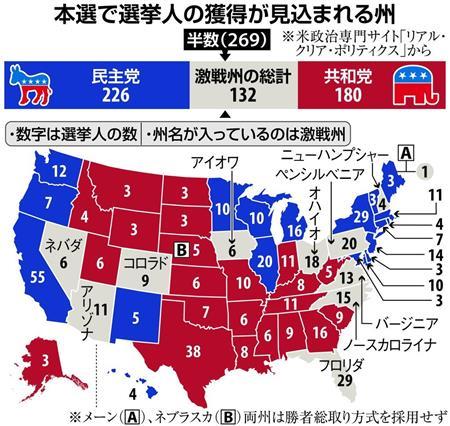 米国は、各州で代表となる選挙人を選出して、州ごとに投票を行う。投票結果で、過半数を取れば、その州の選挙人を総取りという形になります。(※メーン、ネブラスカを除く)